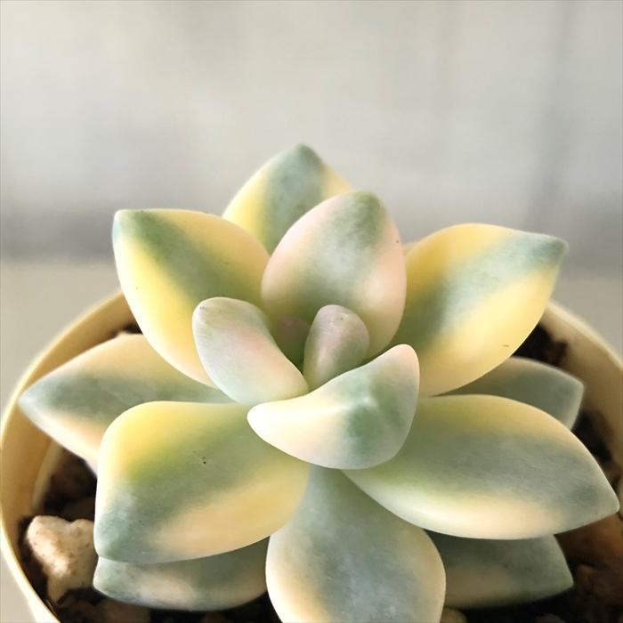 一般的な多肉ちゃん達は『1番いかした時期は冬場の紅葉のシーズンっしょ!』と、なるのが定番ではありますがティテュバンス錦はちょっと違って冬場の魅力的と思われる時期は、なんとなく緑の部分もボヤ〜っとなり斑の感じも黄ばんだ感じになって全体的に、ただただボヤ〜っと白っぽいツマンネ〜お顔立ちになって、なんだか今ひとつな感じになっちゃうんです…